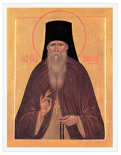 (в миру Александр Гренков) – великий оптинский старец. Родился в 1812 году, с 1839 года подвизался в монастыре Оптина пустынь. Став духовным преемником старцев Льва и Макария, он удостоился благодатных Божиих даров – прозорливости, исцеления, утешения скорбящих. Со всей православной России стекались к нему люди разных чинов и сословий за духовным советом и наставлением. Старец Амвросий имел большое влияние на известных философов и писателей Ф. Достоевского, В. Соловьева, К. Леонтьева. Преставился преподобный в 1891 году. Летом 1988 года он был причислен к лику святых, а осенью того же года были обретены его святые мощи, ныне почивающие во Введенском соборе возрожденной Оптиной пустыни. Память его празднуется Церковью 27 июня (10 июля) и 10(23) октября. |