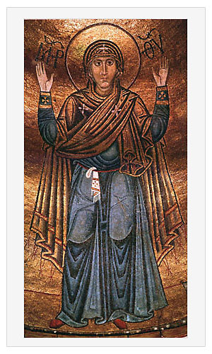 (лат. «молящаяся») – изображение Богоматери без Младенца, в рост, с поднятыми и раскинутыми в стороны руками (ладонями наружу) – традиционный молитвенный жест, напоминающий о молитве пророка Моисея во время битвы: пока его руки были подняты, его народ побеждал, но если он от усталости опускал их, начинали одолевать враги. Воздетые руки Оранты – знак неостановимой молитвы Богородицы за все человечество. На Руси такие изображения часто помещались на стенах храмов и назывались «Нерушимая стена» (напр., Богоматерь Оранта в Киевском соборе св. Софии). Богородица с молитвенно воздетыми руками и с образом Младенца Христа на диске, помещенном у Нее на груди, называется «Богоматерь Великая Панагия (греч. «Всесвятая»)». «Великой Панагией» является одна из древнейших русских икон – «Ярославская Оранта». Поясное изображение Великой Панагии на Руси именуется Знамение. |